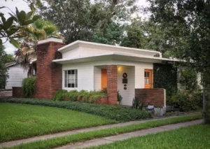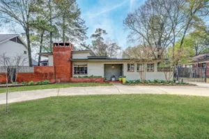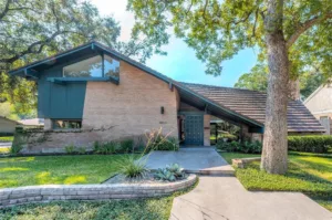 Architect Allen Williams updated the Buffalo Inn Hotel in the mid 1950`s by adding a nifty two-story masonry signature wall and connecting other buildings with walls and canopies. The canopy closest to the pool was used as a sun deck. Note the abstract buffalo logo Williams designed. It was based on Indian drawings and incorporated into the stone building facade. The image is also used as an iron sculpture, lit by a `fountain of colored lights`, located close to the road. By 1969 the inn had been renamed the King Motor Lodge. In 2002, Harris County purchased the property for use as a parking area for the Astrodome.