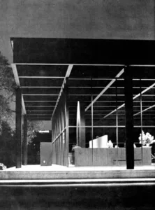 The article discusses that the plan of the rectangular house was based on the requirements of privacy and spaciousness for a family of six. The house employed an open plan, a very private street side and all glass rear façade. Upon entering the house, to the right is an open-air courtyard, which is reminiscent of the Menil House. Walking through another door takes you into the house proper and the sixty foot long living/dining room which are separated by a tall bookcase. The living room side has a large hearth and fireplace. Exposed brick walls are used in the dining room and living rooms as well as the master bedroom. The comparatively small master bedroom is situated as far as possible away from the children’s rooms because the kids were already 10-16 years old at the time the house was built. A wood planked deck, swimming pool, and dense woods round out this beautiful, timeless, and historic Houston home.