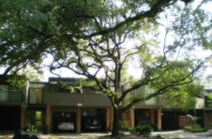 On a winter day, when the leaves have fallen off of the trees, the Maher house can be spied at a distance from Bayou Bend’s gardens. Parts of the house have been altered. The brick has been covered over in favor of a stucco exterior.