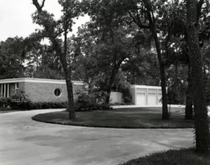 In front of the building`s public façade, along Holcombe Boulevard, stands a fountain without equal in Houston. The fountain consists of a simple rectangular pool with a row of bronze nautilus shells shooting jets of water at a limestone sculpture entitled Wave of Life by noted American artist Wheeler Williams, which depicts a recumbent man and woman holding aloft a child symbolizing the future. Visitors were welcomed with a wide flagstone terrace surrounded by azaleas. At the rear of the building there was an Olympic swimming pool surrounded by an elaborately patterned terrazzo deck shaded by a free-form steel and corrugated fiberglass sunscreen.