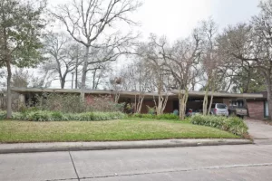 Architect Joseph Krakower, with associate Herb Greene, designed this exceptional house in 1957 for the Salzman family who owned it until 2014. The house incorporates a number of handsome artistic design elements making it a pleasure to experience. When touring, note the repeated triangular theme, pyramidal volumes over several rooms, the corner-placed plate glass windows, and the textured glass elements with graduated divisions. The house was damaged by Hurricane Harvey but has recently been elevated and repaired in a thoughtful manner. It is listed in the AIA Houston Architecture Guide along with the house next door, 3611 North Braeswood, by the same architects.