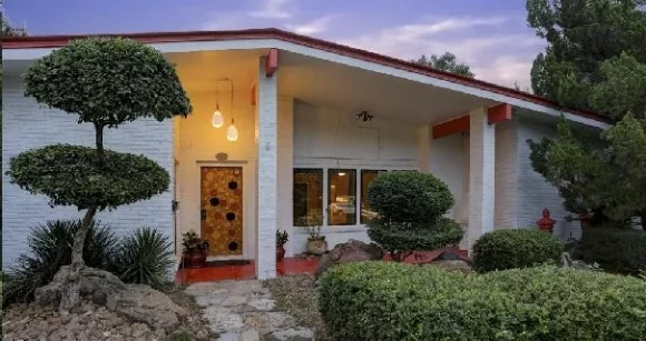 This nifty vintage contemporary style house contains a treasure trove of sought after mod details starting with a rare translucent fiberglass front door and leading through to the glamorous swimming pool and terrace complete with outdoor wet bar and gas-fired Tiki torches. The flowing living areas surround a large and open high ceilinged kitchen still with original arrangement and cabinetry. The breakfast room has an original wall mural, metal screen space dividers, planter box and likely a Higgins glass Rondelay window screen. Many other delightful vintage features complete the scene.